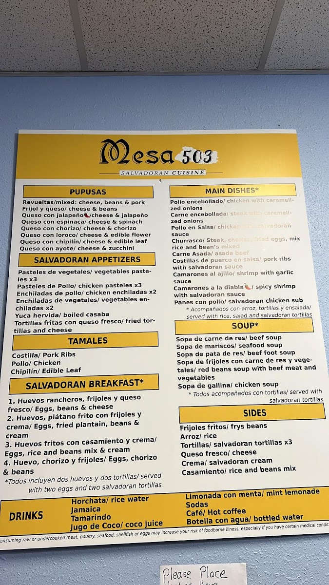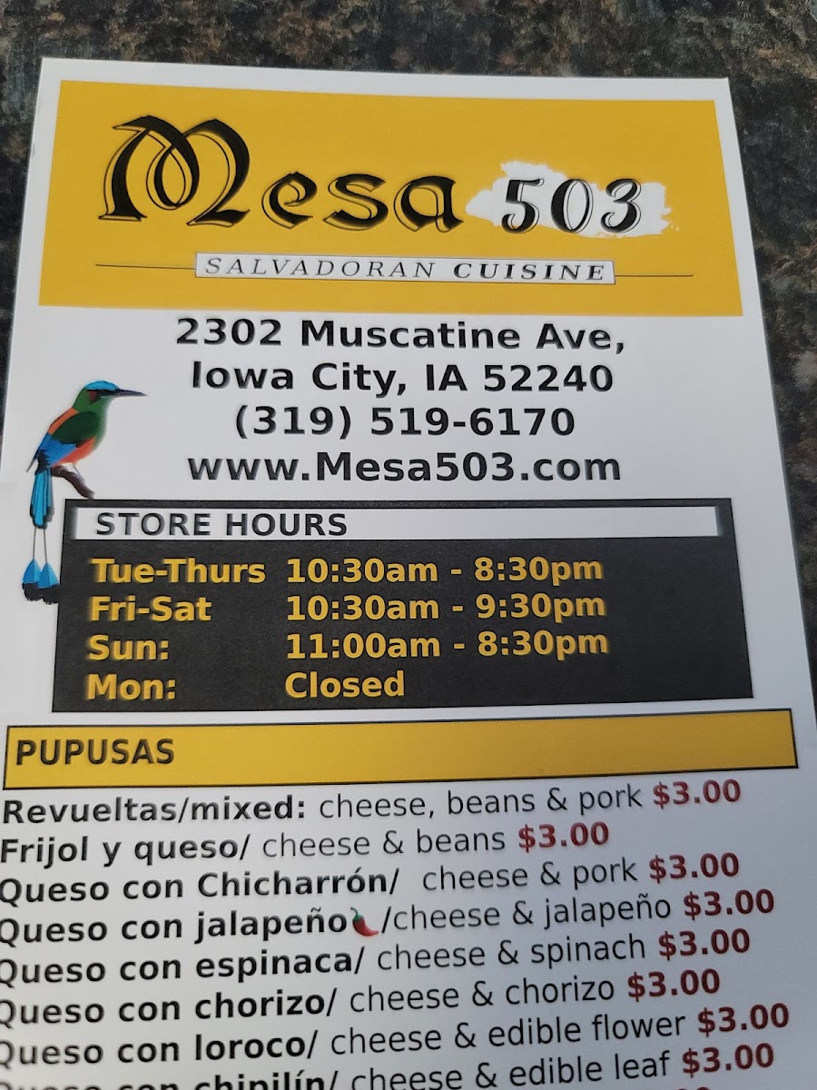 Nestled in the heart of Iowa City, Mesa 503 offers a delightful journey into Salvadoran cuisine. Their menu is a vibrant mix of flavors, making it a must-visit for food enthusiasts. The Platos Principales showcase a variety of expertly crafted dishes, from the sizzling Parrillada featuring steak, chicken, shrimp, and chorizo, to the rich Pollo En Salsa drenched in a traditional Salvadoran sauce. Each plate is served with care, ensuring freshness and authenticity.